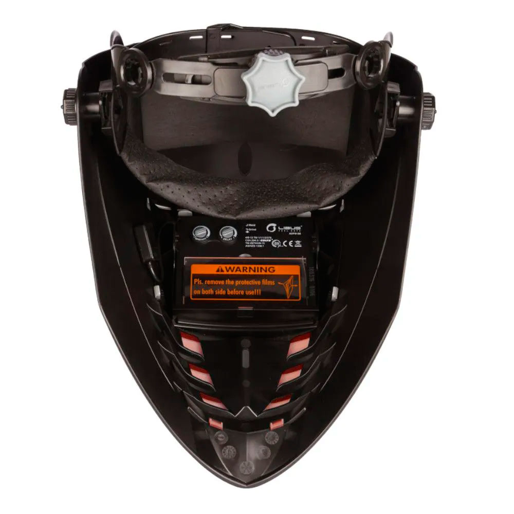 Máscara de solda de segurança Strong Welder 510 da Libus, tipo escurecimento automático, composto de um casco fabricado em polipropileno (PP), suspensão ajustável fabricada em polietileno (PE) com aparador de suor em espuma sintética, placa composta de filtro em LCD e duas lentes em polietilenoglicol co-poliéster (PETG).