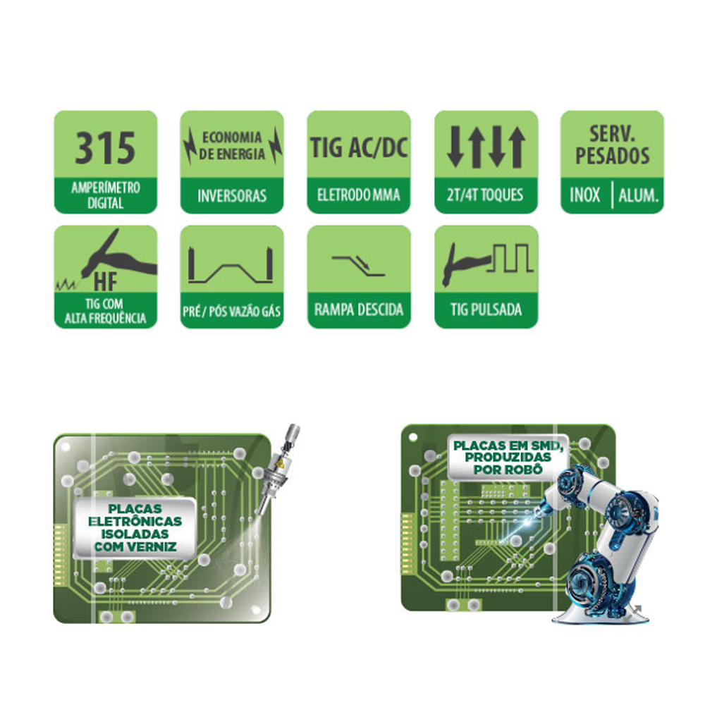 Inversora TIG AC/DC PULSADA com Alta Frequência (HF) e Eletrodo Revestido (MMA)