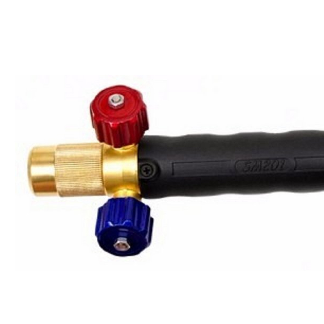 Robusto e resistente seu peso aproximado 0,52 Kg e comprimento de 240 mm, tem um design diferenciado com punho anatômico para melhor encaixe das mãos do operador, suas válvulas de regulagem são feitas em aço inoxidável do tipo agulha para uma regulagem dos gases mais precisa.