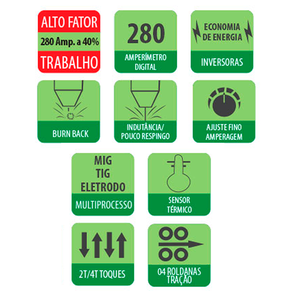 Fator de Trabalho: 220V - 220 Amp. a 60% 155 Amp. a 100%